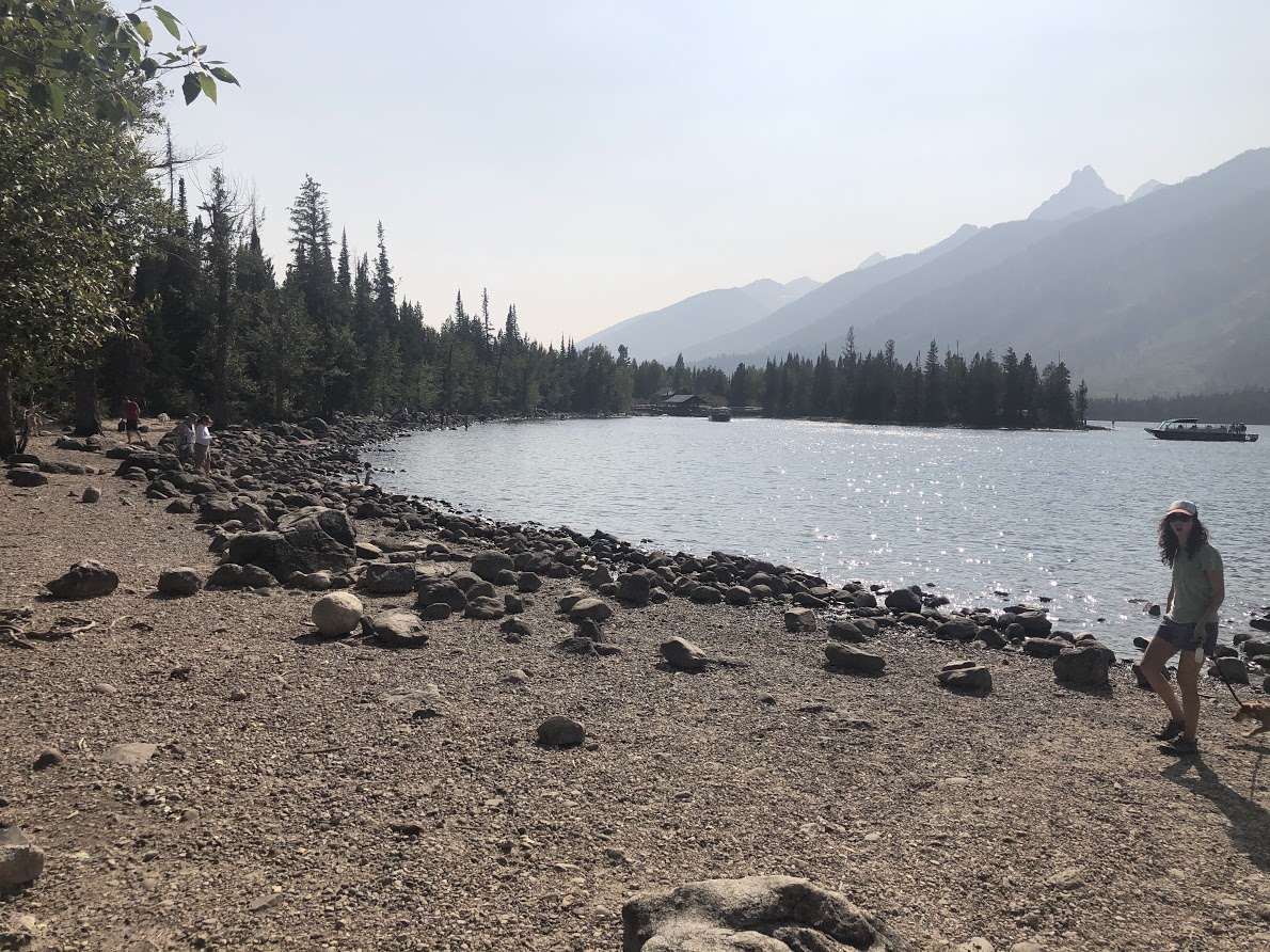 We entered the park and made our first stop at the Visitor’s Center. We got our official pamphlet, purchased a few stickers, and headed off to hike around Jenny Lake! The views were slightly obscured by smoke from the wildfires, but nonetheless they were amazing! We spent a good while just staring out across Jenny Lake at the Tetons shooting up into the sky! The smoke does not photograph well, so the pics didn’t turn out great, but the view in person was much less hindered. The park does have at least one nice hiking trail that allows dogs (if traveling to NP’s with dogs, you need to do your research), so we completed the hike around the lake and decided to see what else Grand Teton had to offer. We found our say to Signal Mountain, which provides incredible views of Jackson Hole! It also shares its name with a mountain just north of Chattanooga, where I grew up and we raised our girls, so we could not pass up this opportunity!