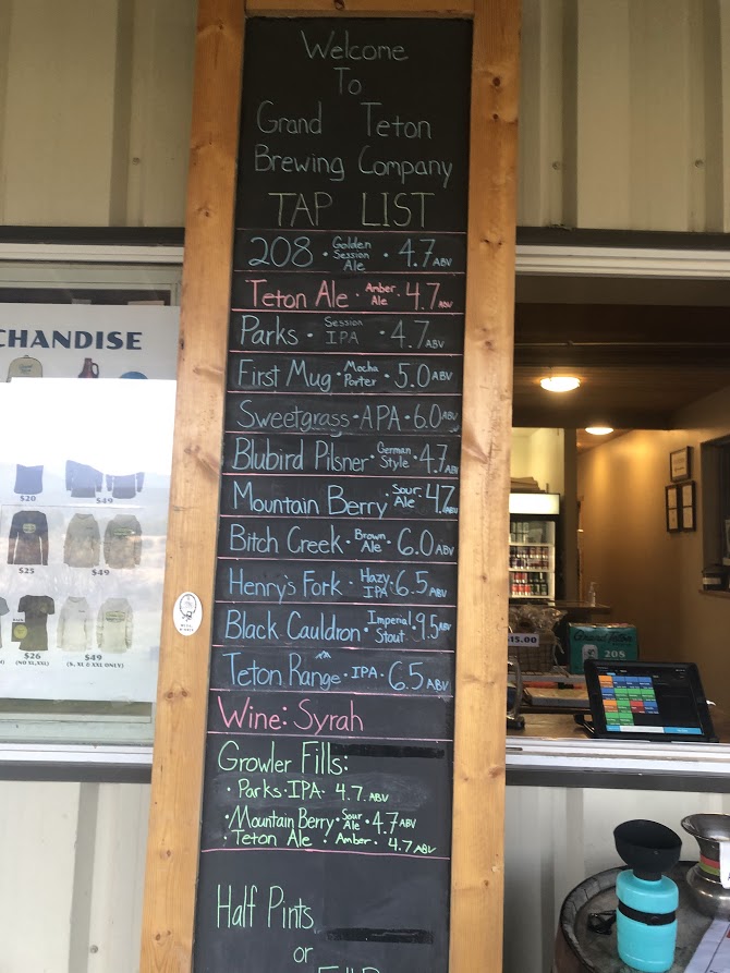 We had high expectations for Grand Teton NP, and it certainly delivered! On our way back to camp, we stopped at Grand Teton Brewing Company, of course! We sat outside in Adirondack chairs, looking out at Teton Pass and the beautiful Idaho landscape before us, sipping some fantastic beer and discussing our plans for the next day. I’m not sure that it really gets much better than that! After a rough start to the day, it was nice to have the rest of it go so very well!
