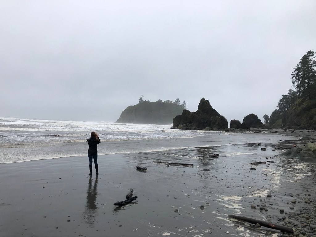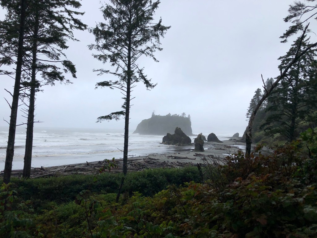 The next morning, we packed up Fleetwood Mac with plans to explore a bit more of what Olympic NP has to offer, on our way down to Portland, Oregon. Our first stop was at Ruby Beach. It was a chilly, overcast morning and the fog over the water restricted our view, but that did not stop us from having a nice stroll on the dark gray sand. We ventured far enough away from the other tourists to let Stella stretch her legs on the beach – that dog sure does love to run in the sand!