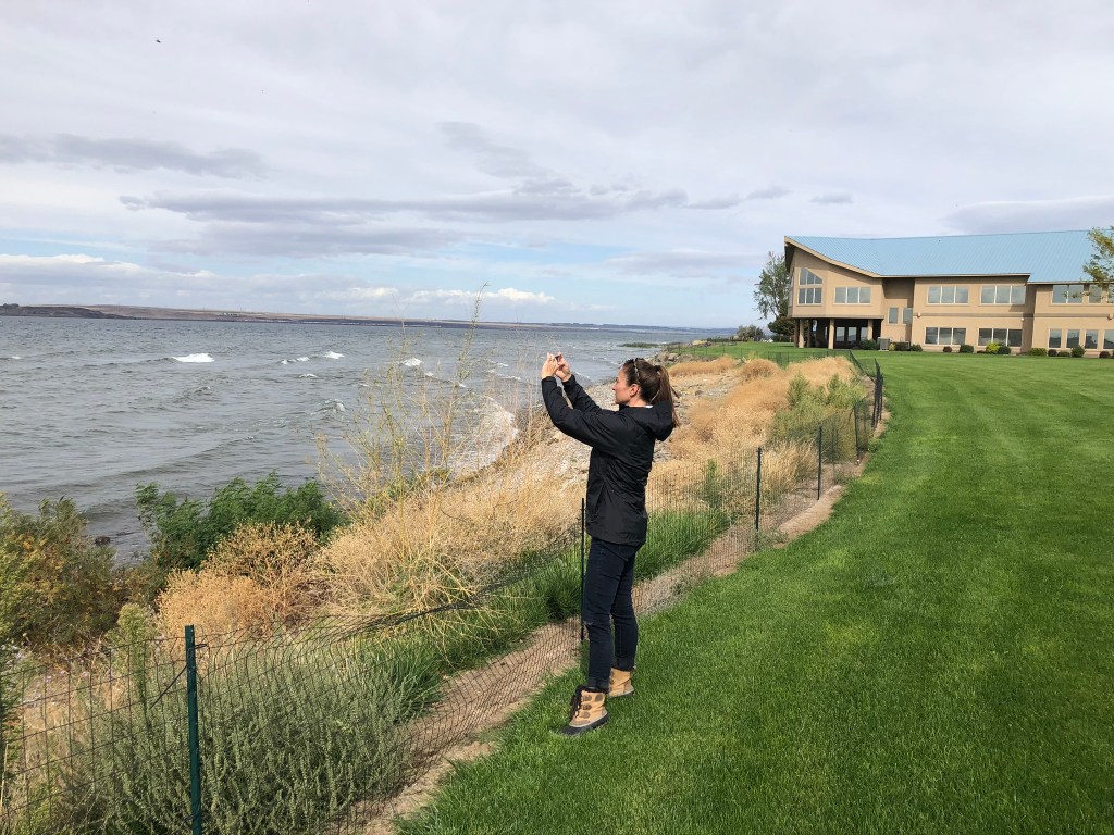 We made a gas stop in the Dalles (pronounce like pals, only with a D), and then a lunch stop at Burnt Field Brewing, in Boardman, Oregon. We had some delicious pizza, great beer, and a nice break from the road. There was a very large park with wide open, grassy space so we let Stella get in a good run! She was thrilled! Jen and I stood at the bank of the Columbia River, and admired the vineyards across the river on the Washington bank.